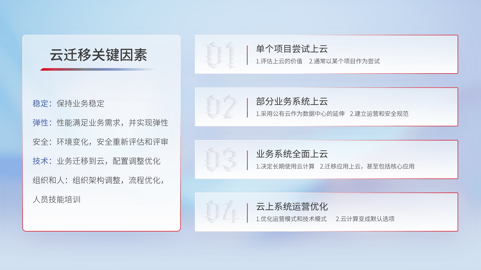 结合实际业务,,,,从规划设计、、云平台选型、、、云原生改造、、数据迁移、、集成交付,,迁移全过程为客户识别最佳上云路径,,,做好风险识别管理,,,,设计网络架构、、身份权限、、、、安全审计合规、、操作审计、、、日志审计、、监控告警策略、、、、多站点容灾设计等,,对云上基础设施进行整体规划,,提升IT治理水平,,,以满足弹性、、、、高可用、、、高性能的需求。。。