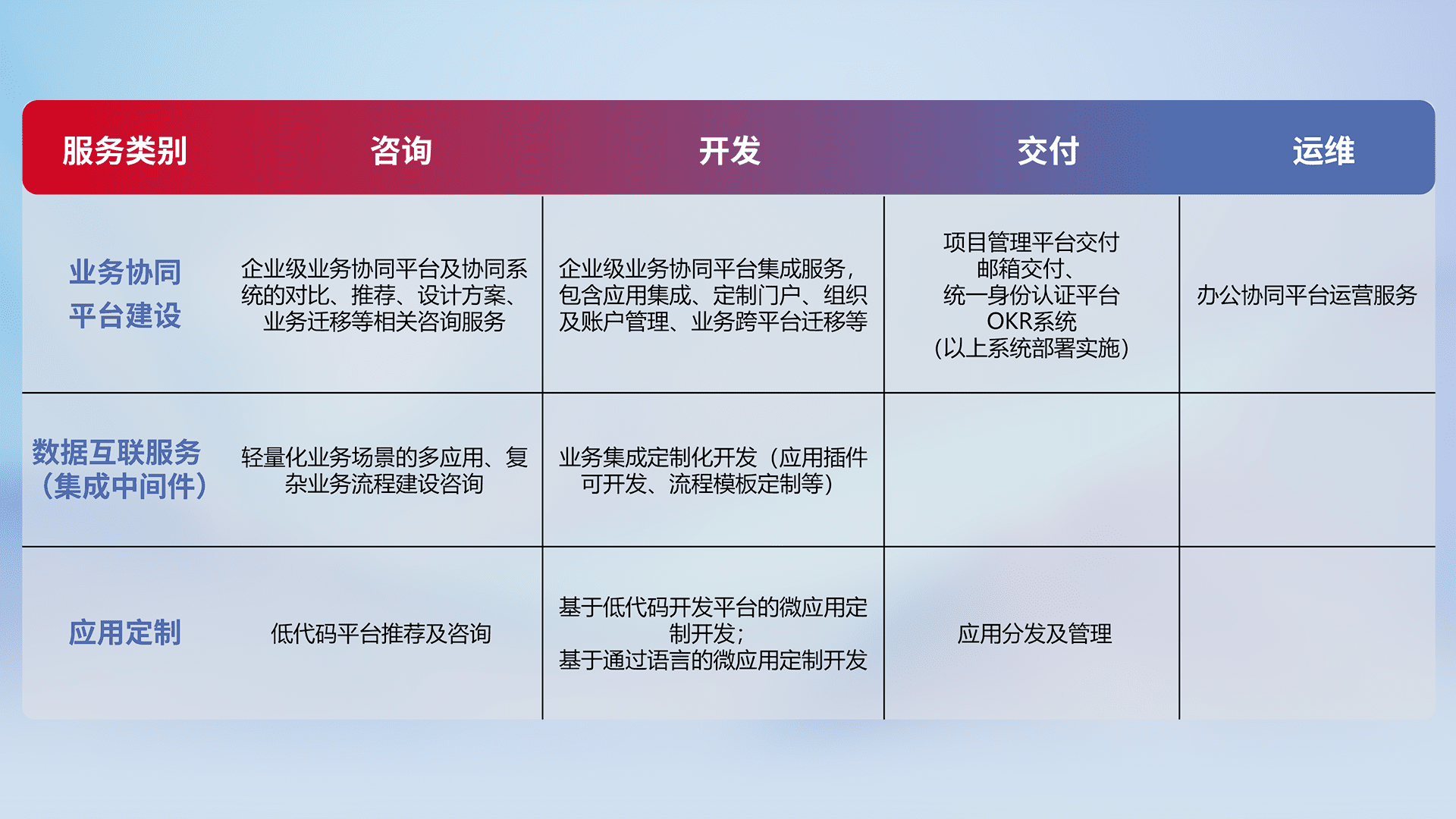 针对钉钉、、企微、、IDaas等平台级产品提供产品的规划、、、、方案、、交付、、定制化开发等服务,,,实现如统一协同办公、、智能客户服务、、、混合会议管理、、、智能数据查询、、、、等业务场景,,,,实现数字化转型。。。